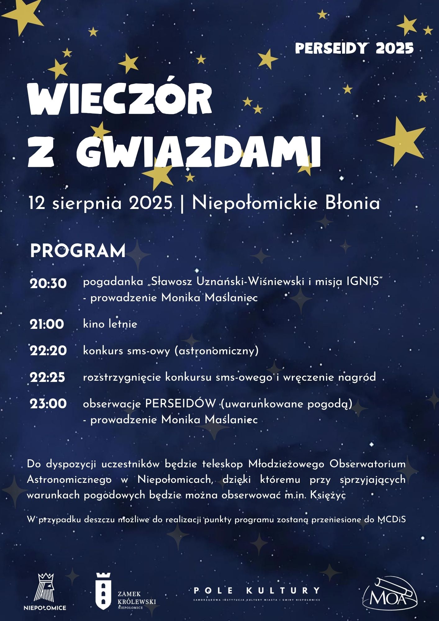 Podczas trwania wydarzenia pokazy i obserwacje nieba (uwarunkowane pogodą).